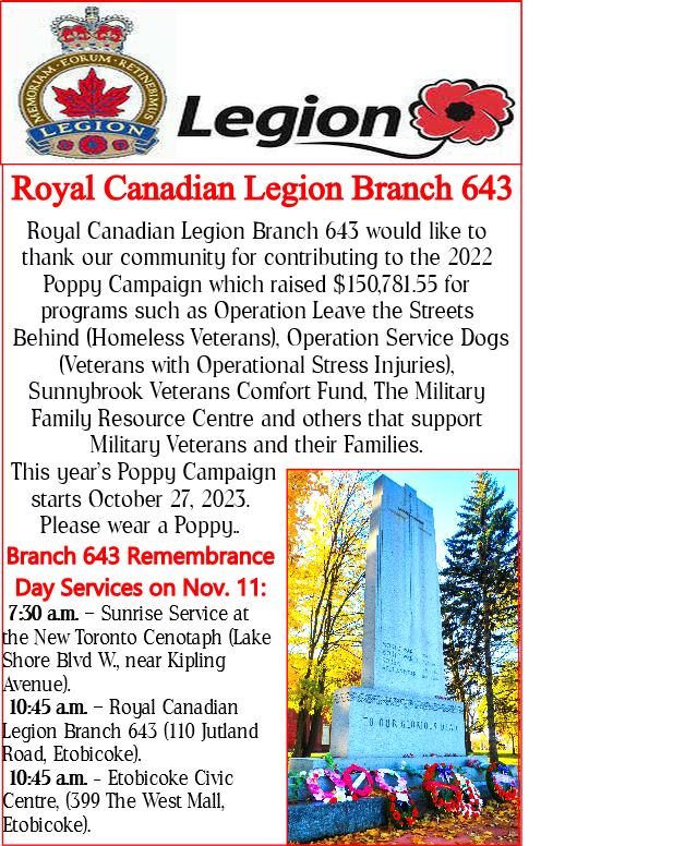 A reminder from the Royal Canadian Legion Branch 643 November 4, 2023 by Toronto Newswire Remembrance Day services in the community.