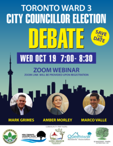 For those following the civic elections. Prepare your questions for Ward 3 councillor challengers in an October 19 opportunity on Zoom to question Councillor Mark Grimes, who has clung on to the Etobicoke Lakeshore riding for 19 years and counting. Local favourite Amber Morley and Marco Valle will have much to ask the incumbent. So can you.