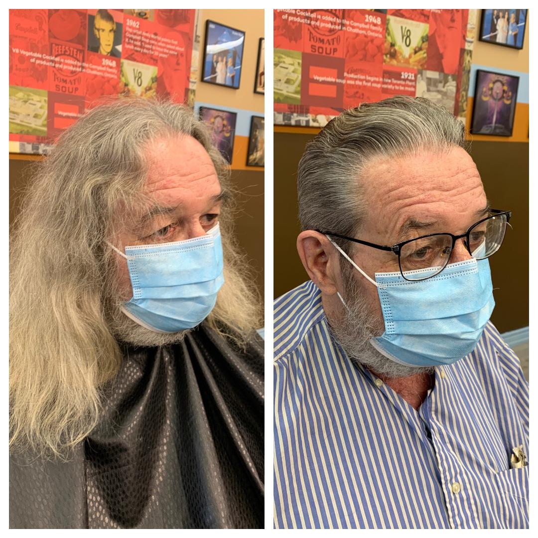 SENIOR GETS free haircut from generous New Toronto barber and chance to meet some new friends. Courtesy photo.