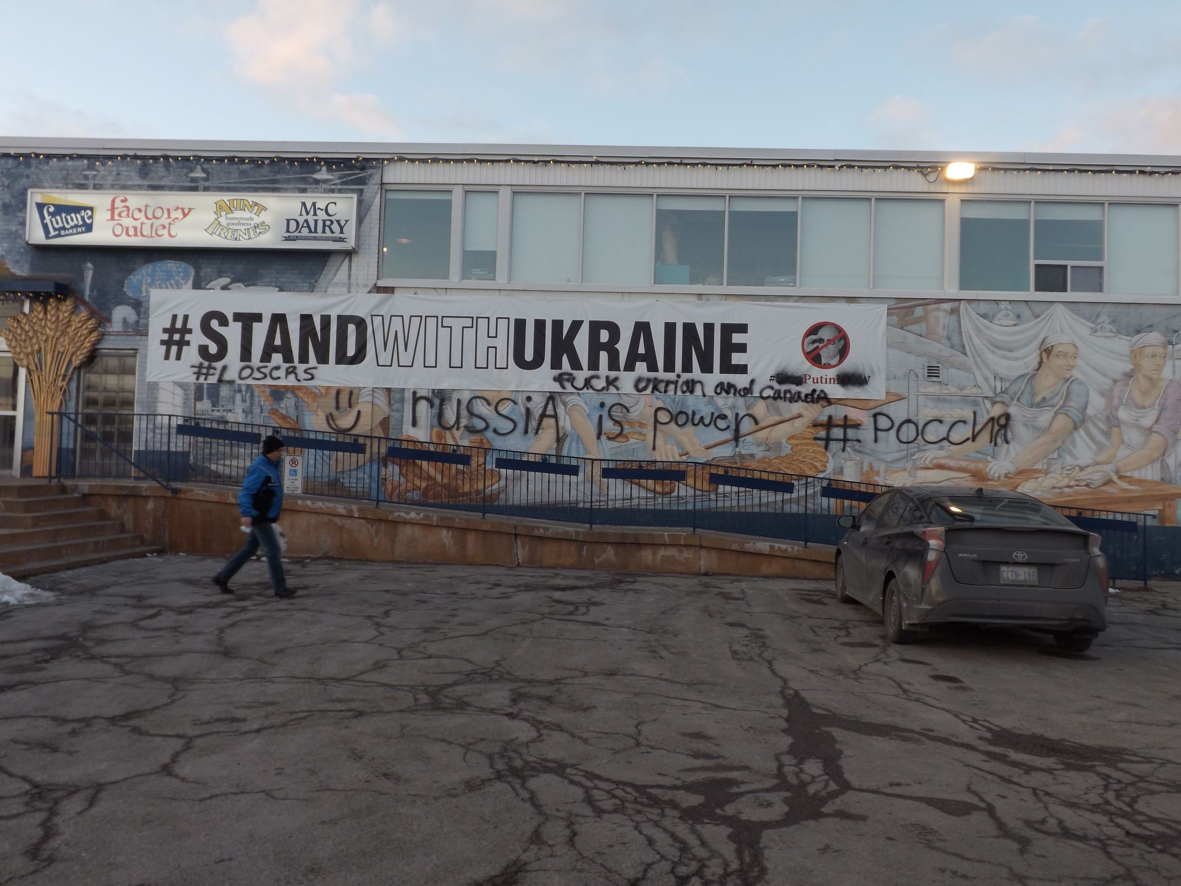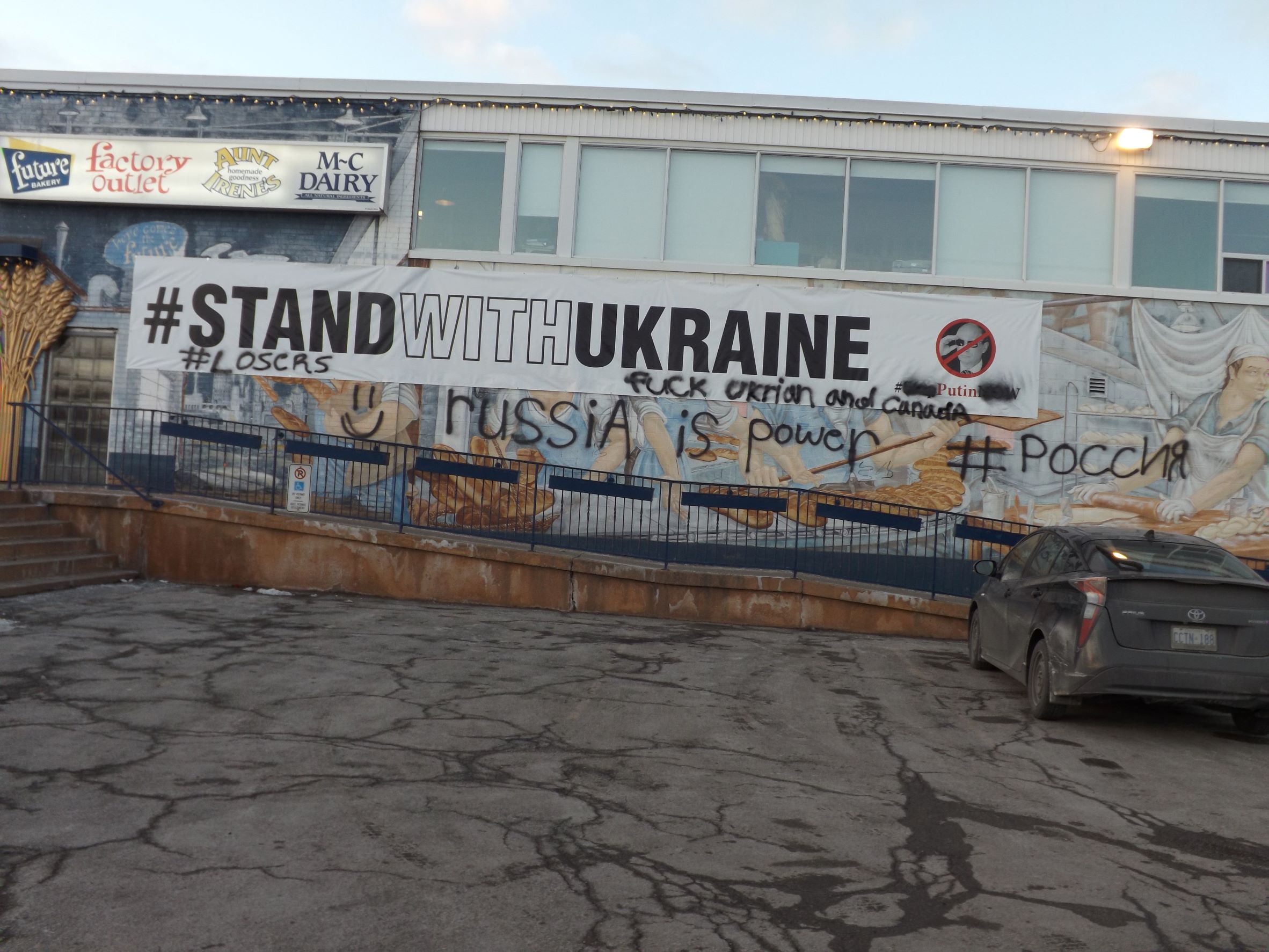 Phrases in black paint were written on the banner and the wall, including “F— Ukrian (sic) and Canada,” “#Losers,” and “Russia is power,” as well as the word “Russia” in both Russian and English.