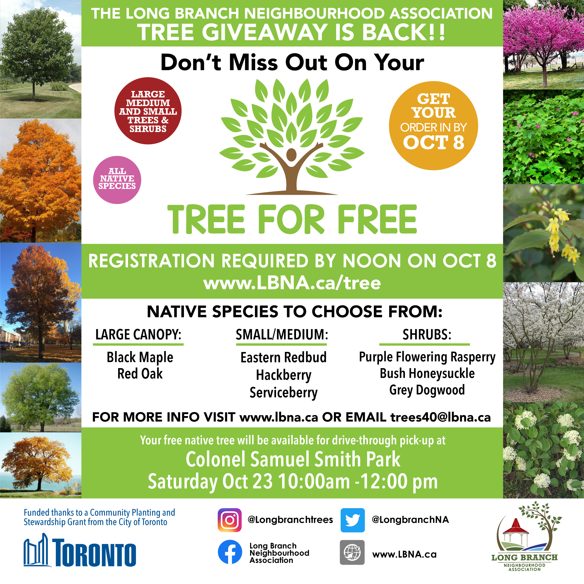 Its that time of the year when you can get a free tree from the Long Branch Neighbourhood Association. Register for your tree on October 8 at Colonel Samuel Smith Park, and pick them up on October 23. Its a Tree for Free. Here are some other free activities also taking place in our community.