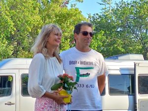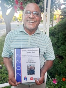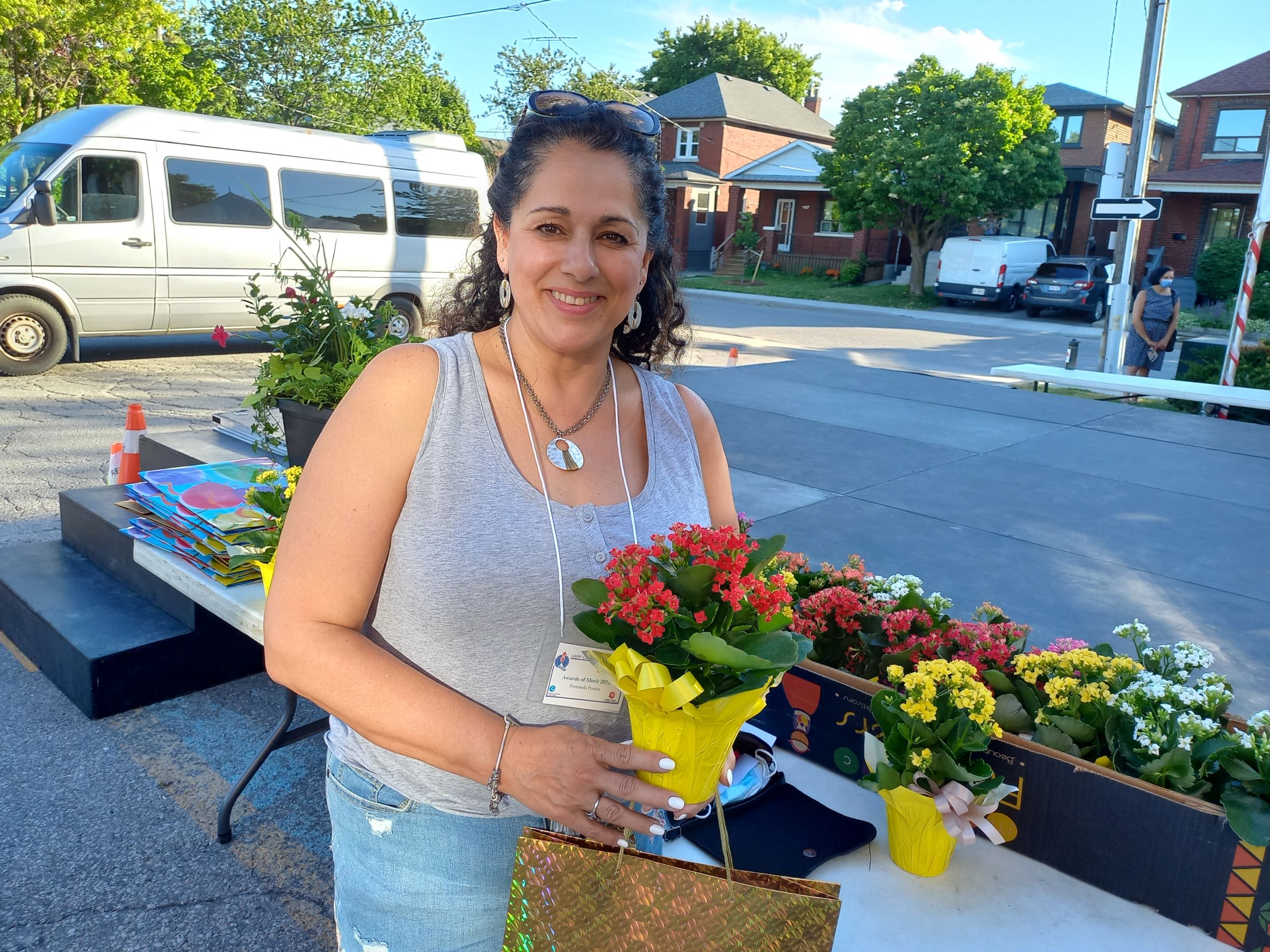 FERNANDA PONTES of Haven on The Queensway with flowers and Award of Merit for her dedicated work. On front page is volunteer Zai Batasar with Award of Merit winner Don Harrison Short. Photos by Tom Godfrey.