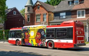 Cote, who has painted many Native murals in the community, now has a new mural rolling around the city on a sides of a TTC bus.