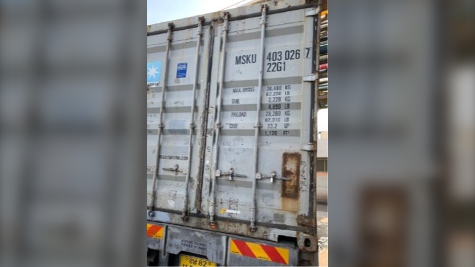 The photos show a grey shipping container, marked MSKU 403 026 7 22G1.