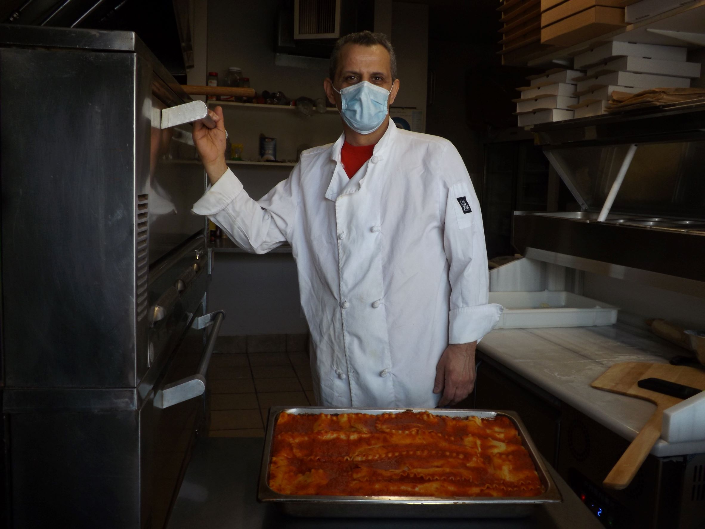ADRIANO “The King of Lasagna’ COOKS another lasagna that will be gone soon to thankful customers. Photo by Tom Godfrey.
