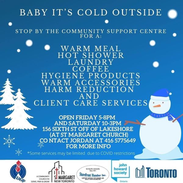 COMMUNITY SUPPORT CENTRE operating from St. Margaret’s Church on Saturdays from 11 a.m. to 3 p.m. Meals, snacks, washrooms, showers, and