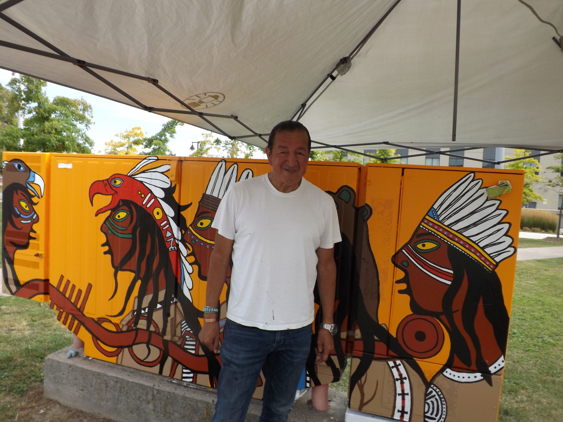 The native Sundancer, pipe carrier and sweat ceremony leader, has been working on a traffic signal box in the Kipling Ave. and Lake Shore Blvd. W. area for a week. He expects to finish the painting next week.