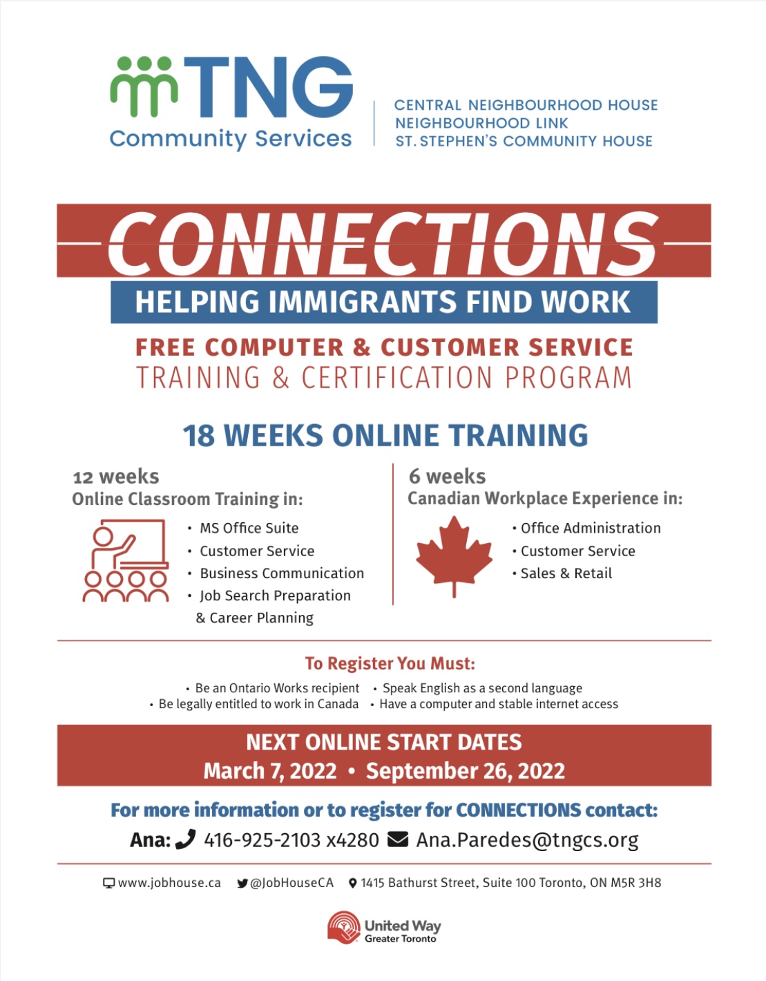 SUMMER YOUTH JOB CONNECTION for students aged 15 to 18 to obtain 20-hours of paid pre-employment training, free certification, training and work-related supports. Must be eligible to work in Ontario and be ready and willing to work during COVID-19, March Break and Summer 2022. Contact Sheroni at 416-405-5259 or email