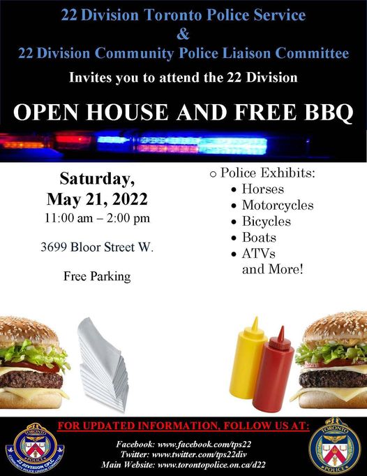 The community is invited on Saturday May 21 to 22 Division Toronto Police Station for an Open House and free barbeque from 11 a.m. to 2 p.m. at 3699 Bloor Street W.