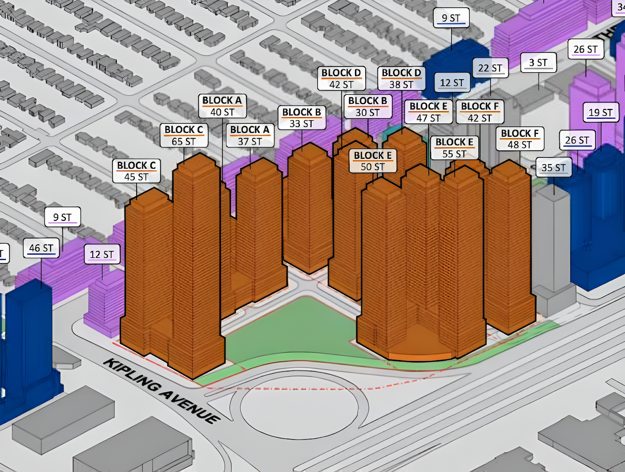Plans filed called for mid-rise buildings to line The Queensway, stepping up to taller forms toward Kipling Avenue and the Gardiner Expressway ramps.