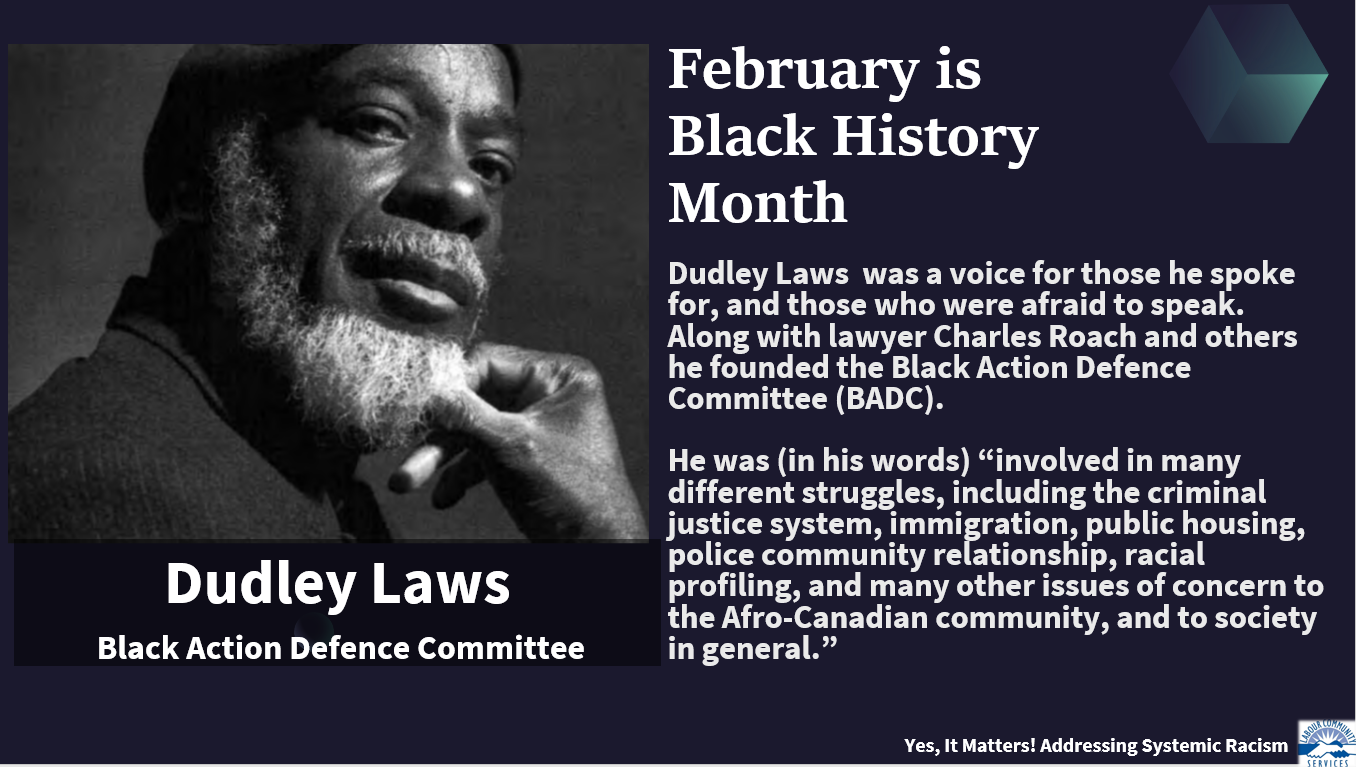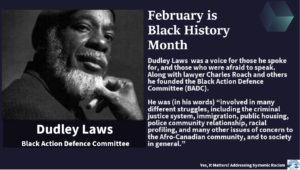 Laws is described as a Canadian civil rights icon who as Executive Director of the Black Action Defence Committee, which worked to combat anti-Black racism in policing.