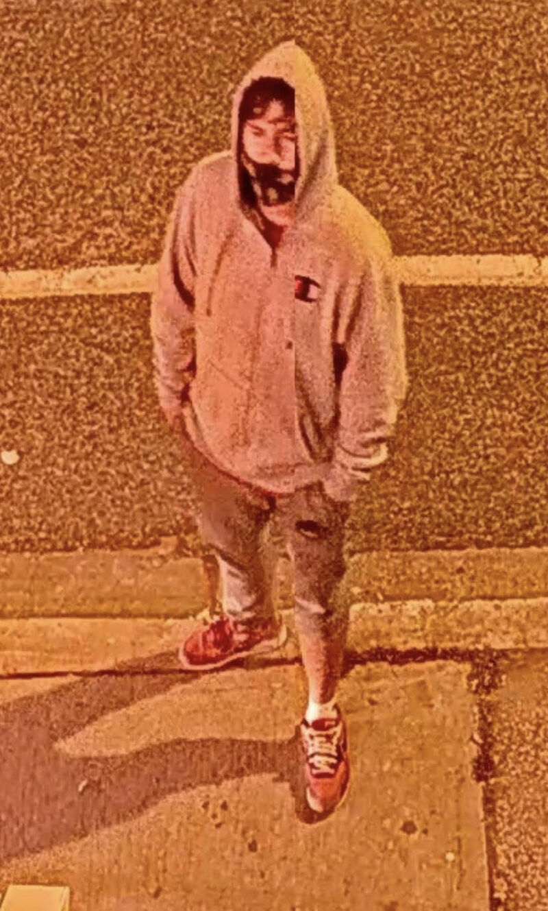 The suspect is described as being about 25 years old, 5-foot 8-inches, medium build with red facial hair. He was wearing a grey Champion brand hoodie, salt and pepper Roots sweatpants and red shoes.