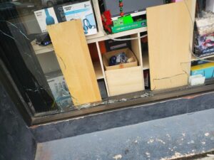 He said a large sheet of plywood had to be placed to protect his store until a glass installer can find time to fix the damages.