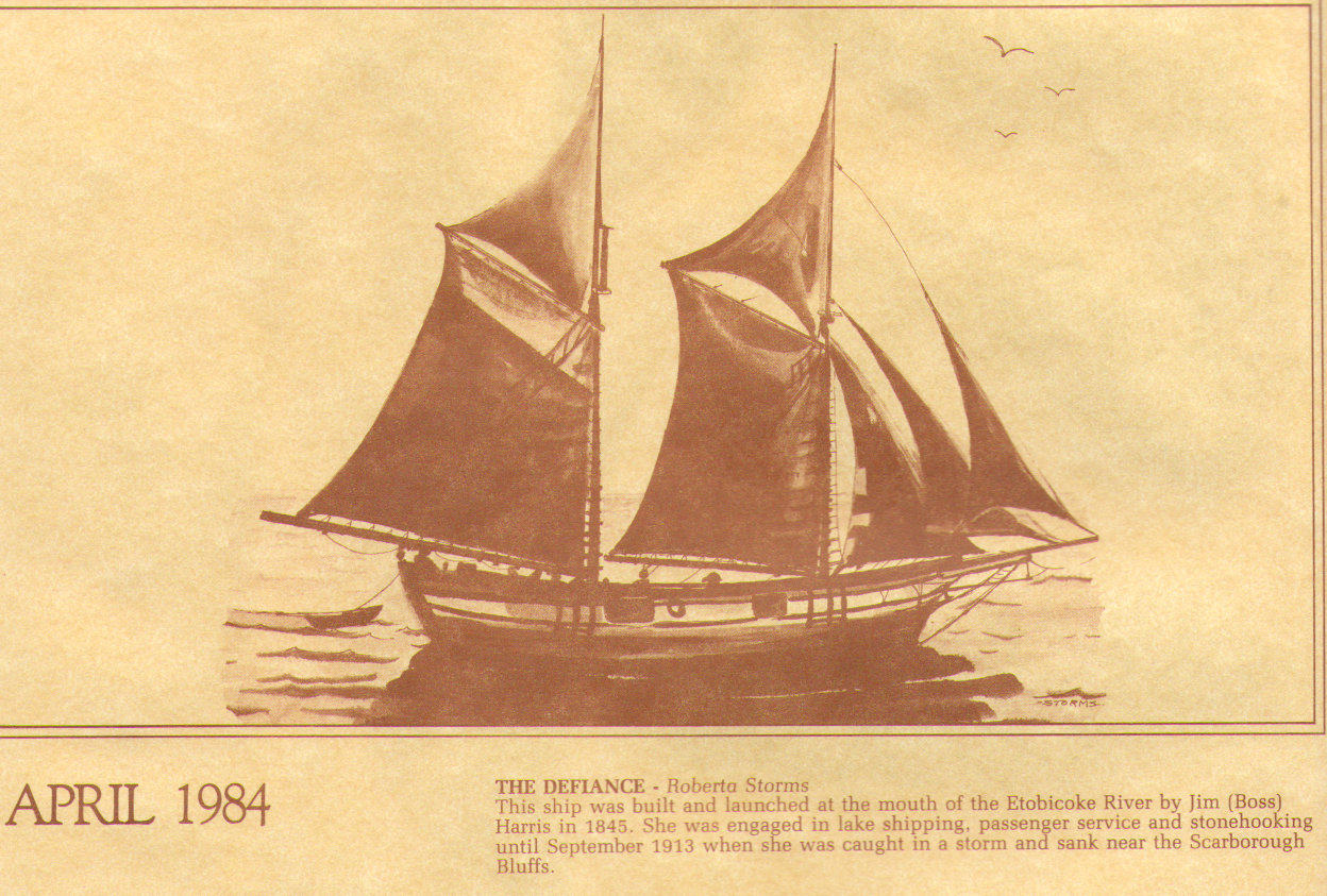 This ship was built at the mouth of the Etobicoke Creek in 1845. One year after the tragic sinking of the Titanic, the Defiance succumbed to a wicked gale off the Scarborough Highlands, also known as the Bluffs, and went down in 1913. It is not known how many sailors died.