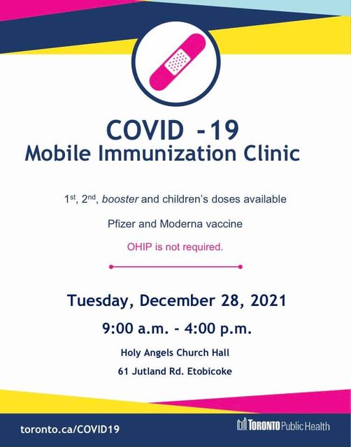 Where to find some vaccines and other events in the community December 26, 2021 by SouthEtobicokeNews If you are looking for vaccinations there are some available on January 28 at Holy Angels Church Hall, at 28 Jutland Road. A mobile immunization clinic will be at the church from 9 a.m. to 4 p.m. See flyer. Getting innoculated Craving change The Snyp Truck Winter Drive GOOD VIBES only COMMUNITY Cookbook 2021 for sale YOUTH JOB Connection