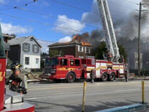 Brave fire fighters put out a smoldering house fire in New Toronto in which a woman suffered burn injuries. Photo by Kathie Bishop.